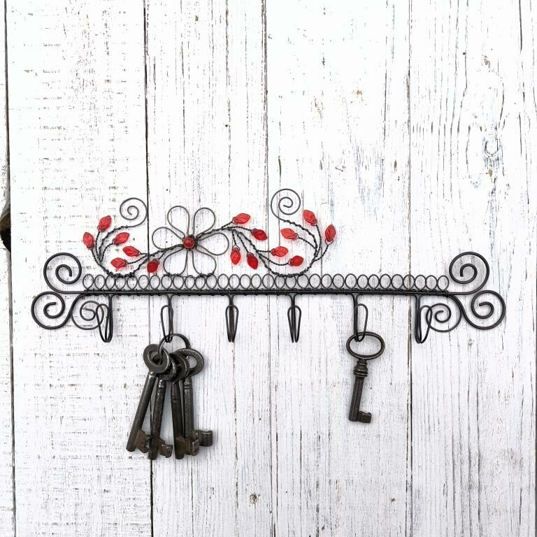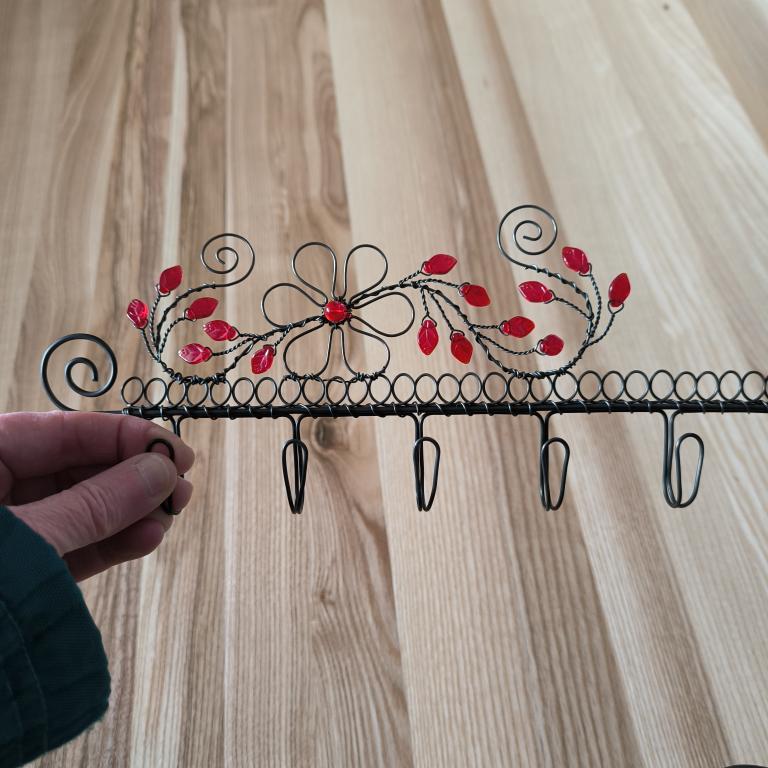 Drátovaný věšák z černého žíhaného drátu, výška 10,5cm, šířka 33,5cm, 6 háčků.  Věšáček je zdobený skleněnými červenými korálky a lístečky.