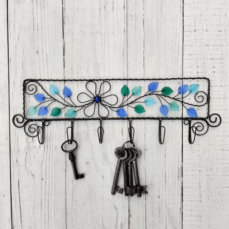 Drátovaný věšák z černého žíhaného drátu, výška 10cm, šířka 32,5cm, 6 háčků. Věšák je zdobený skleněnými korálky a lístečky.