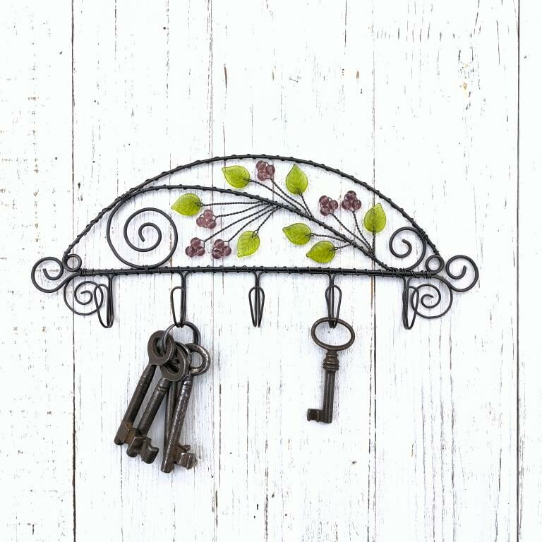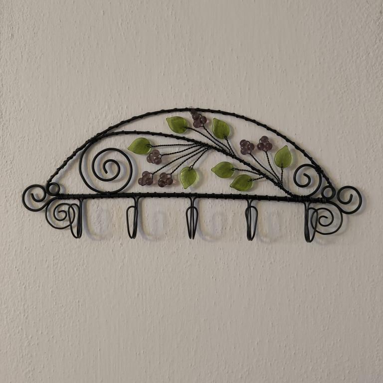 Drátovaný věšák z černého žíhaného drátu, výška 10,5cm, šířka 27cm, 5 háčků. Věšák je zdobený skleněnými korálky a lístečky.