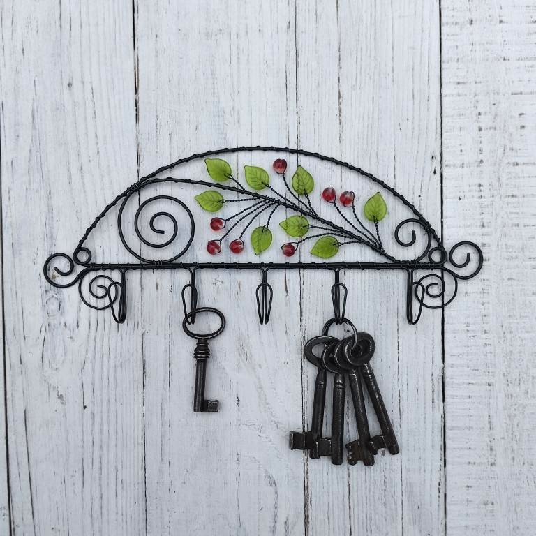 Drátovaný věšák z černého žíhaného drátu, výška 11cm, šířka 27cm, 5 háčků. Věšák je zdobený skleněnými korálky a lístečky.